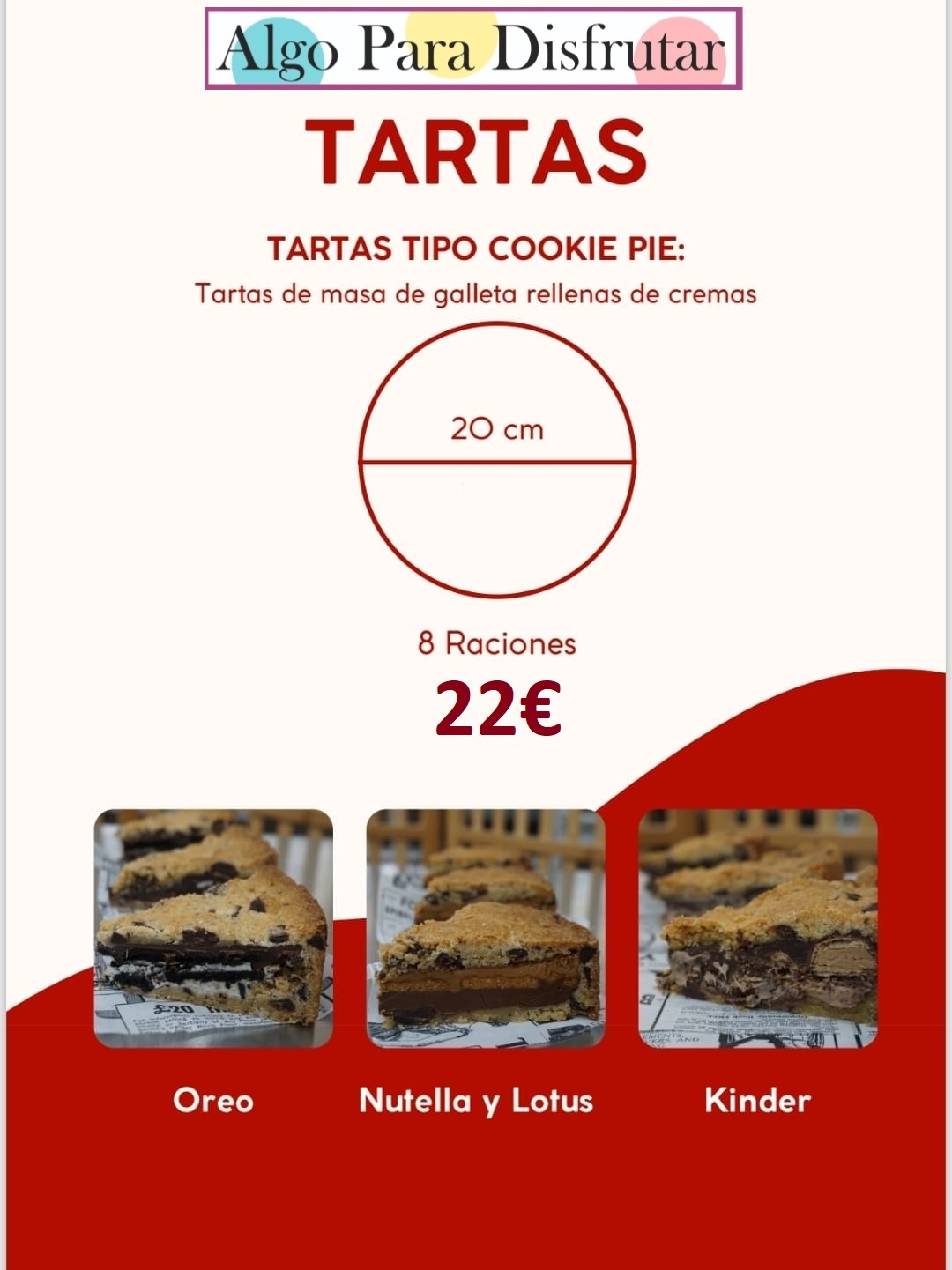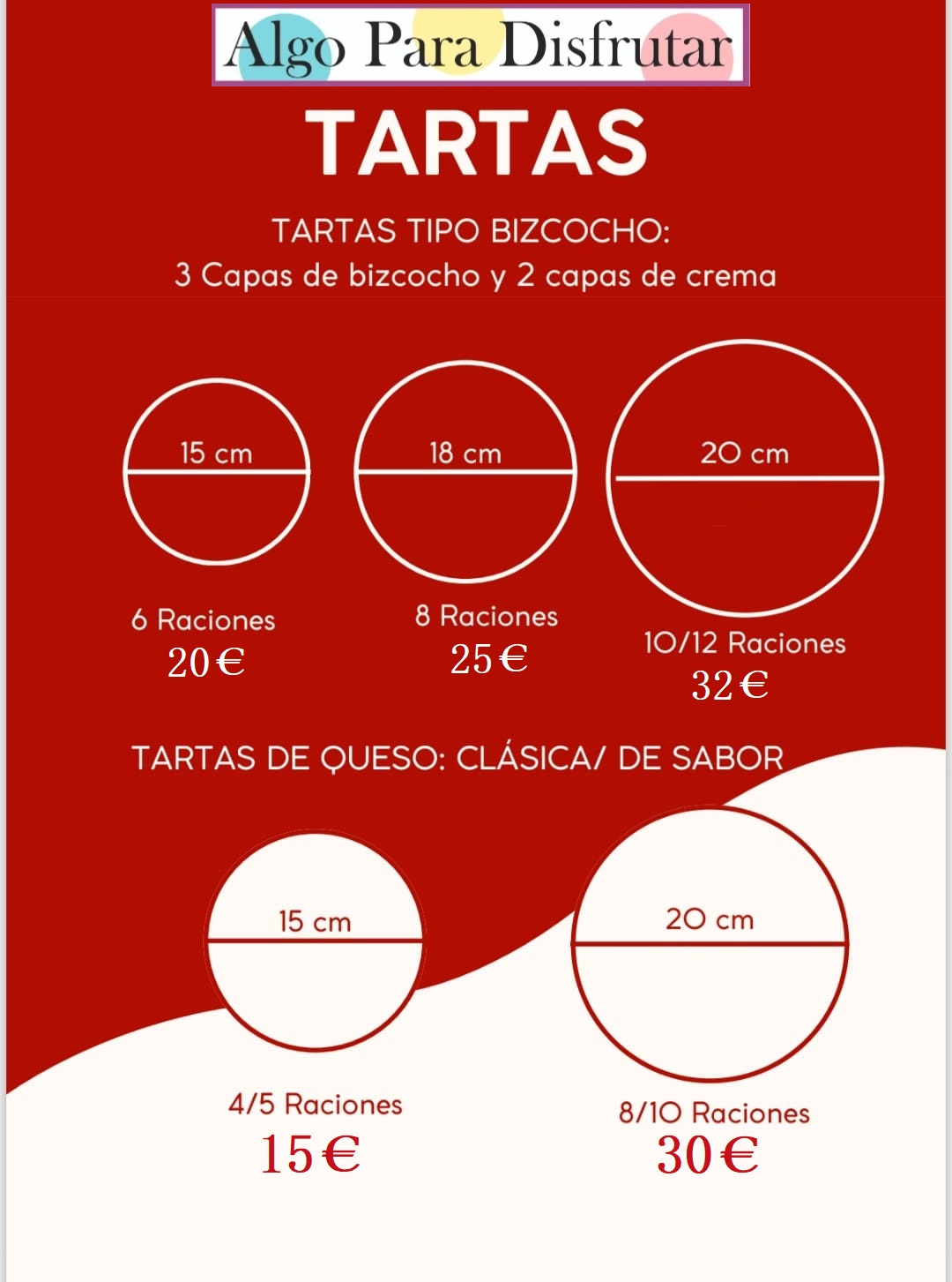 Nuestras tartas están disponibles en varios tamaños, ideales tanto para pequeñas celebraciones familiares como para eventos con más invitados.